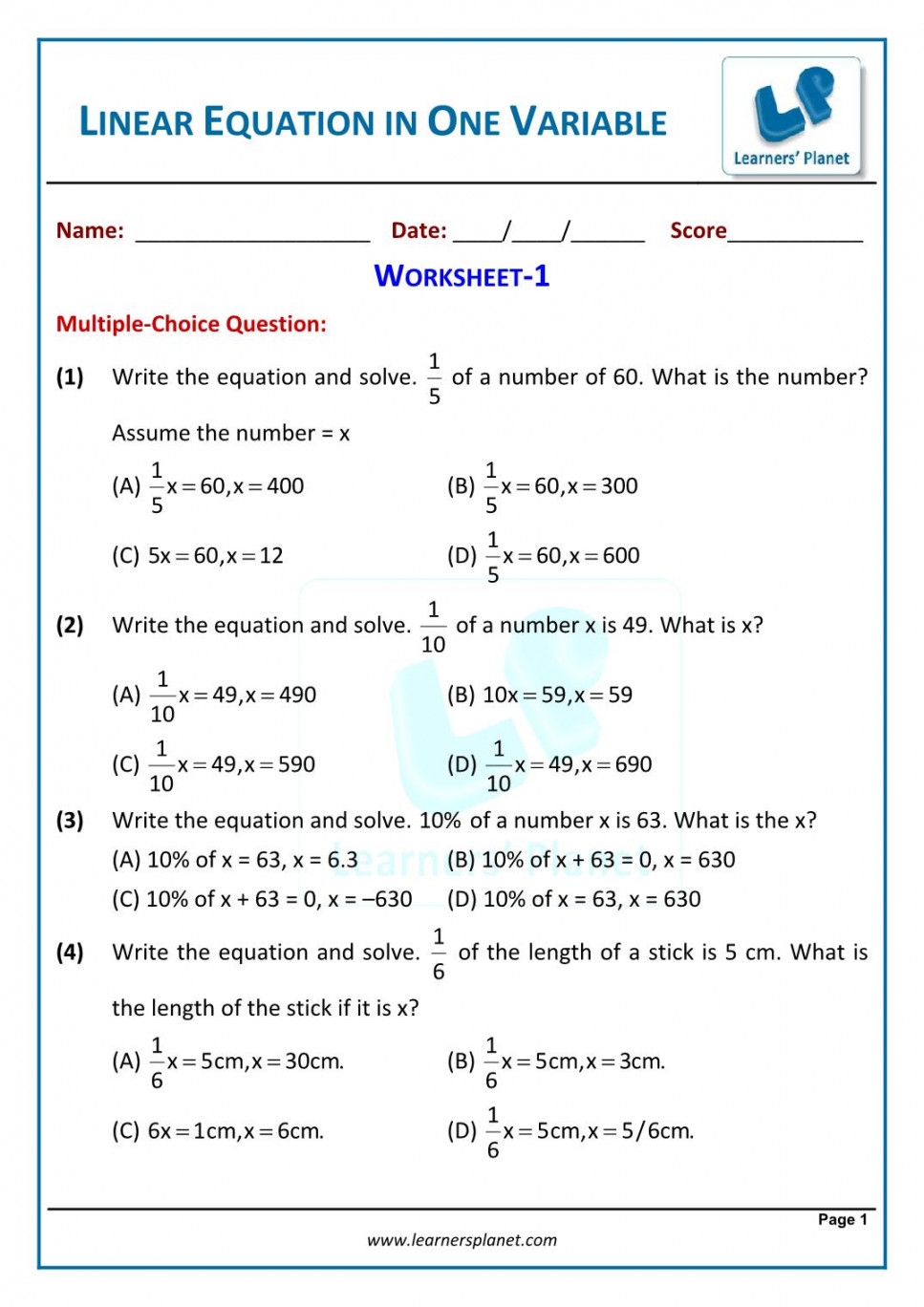Worksheets on linear equations in one variable can vary in difficulty, allowing students to progress from basic equations to more challenging problems. This gradual increase in complexity helps students build confidence in solving a wide range of linear equations and prepares them for more advanced algebraic concepts in higher grades.