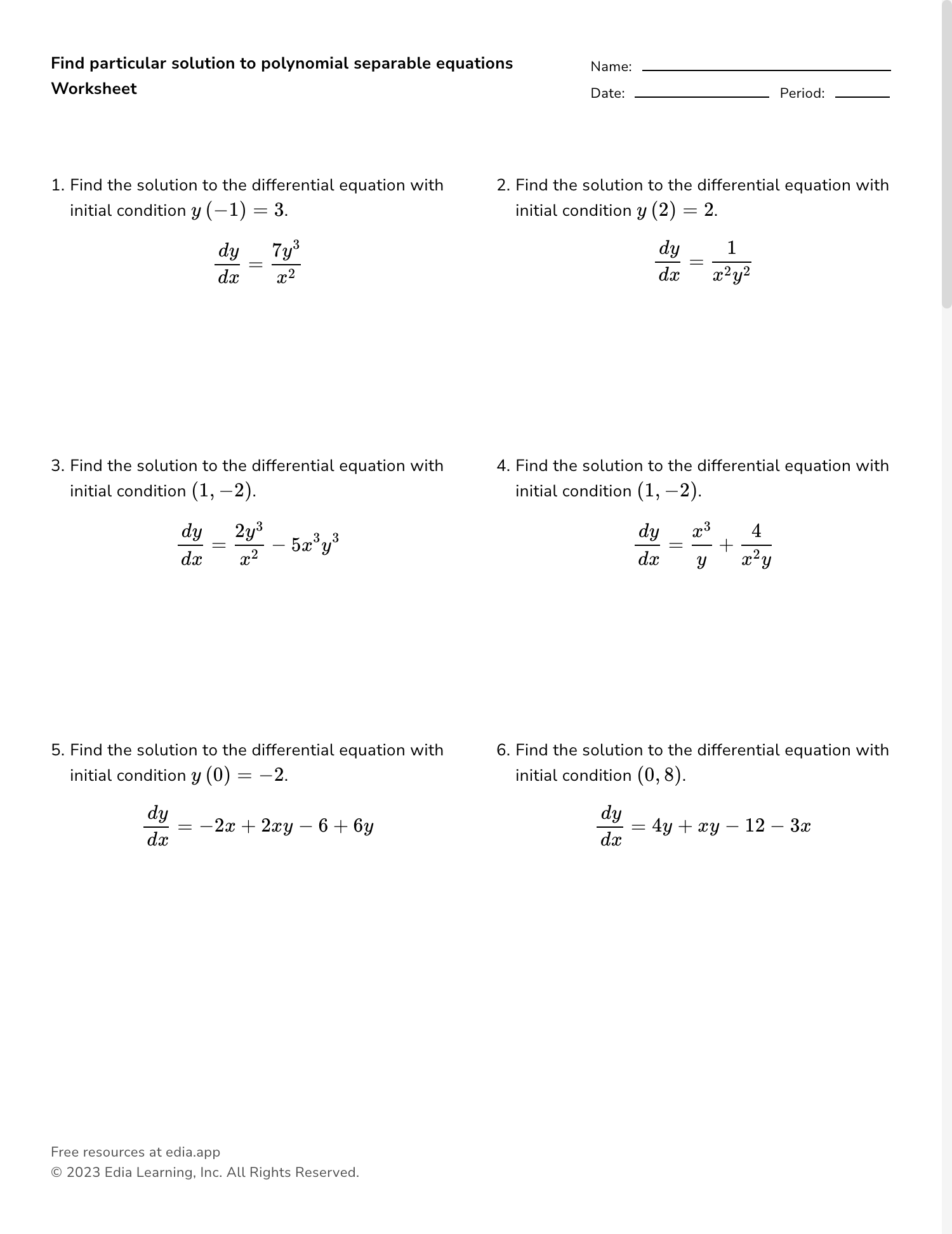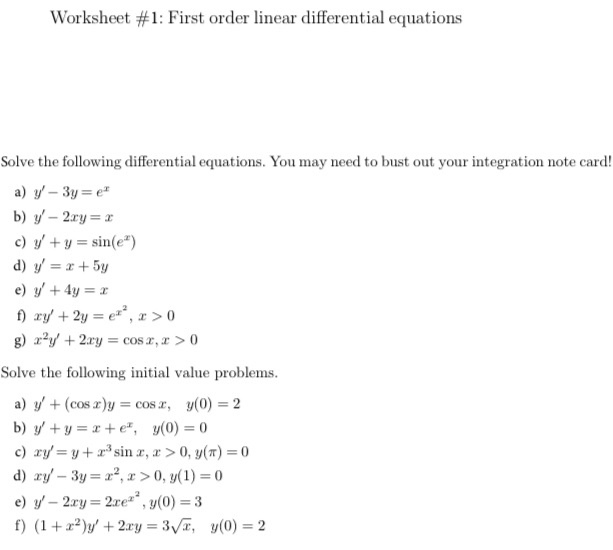 Here is a worksheet on differential equations that covers various topics and levels of difficulty: