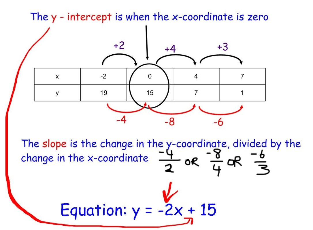 After finding the slope, you can then determine the y-intercept of the line. The y-intercept is the point where the line crosses the y-axis. To find the y-intercept, you can substitute the slope and one of the points from the table into the equation y = mx + b, where m is the slope and b is the y-intercept.
