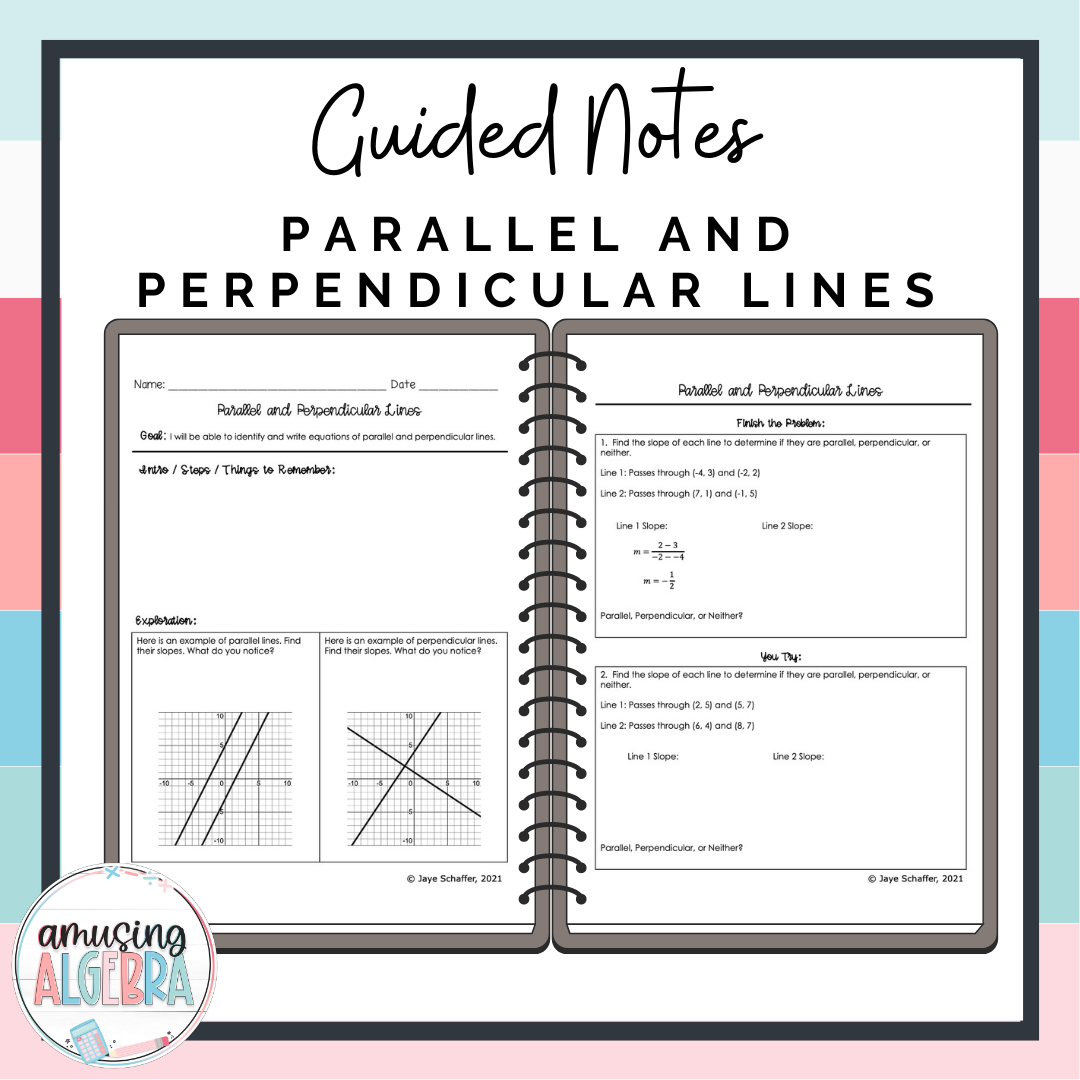 On the other hand, when writing equations of perpendicular lines, you need to determine the negative reciprocal of the slope of the given line. This new slope will be used in the equation y = mx + b, along with a point on the line, to find the y-intercept and complete the equation. Perpendicular lines will intersect at right angles and have slopes that multiply to -1.